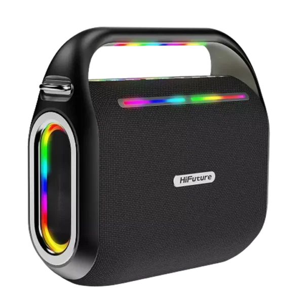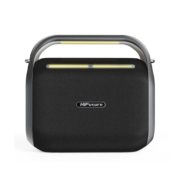 L’enceinte HiFuture MusicBox 200 est une enceinte Bluetooth portable de \(100W\) dotée de deux microphones sans fil, d’une batterie de \(12000mAh\) qui sert également de banque d’alimentation, de lumières RGB, et de la fonction TWS (True Wireless Stereo).