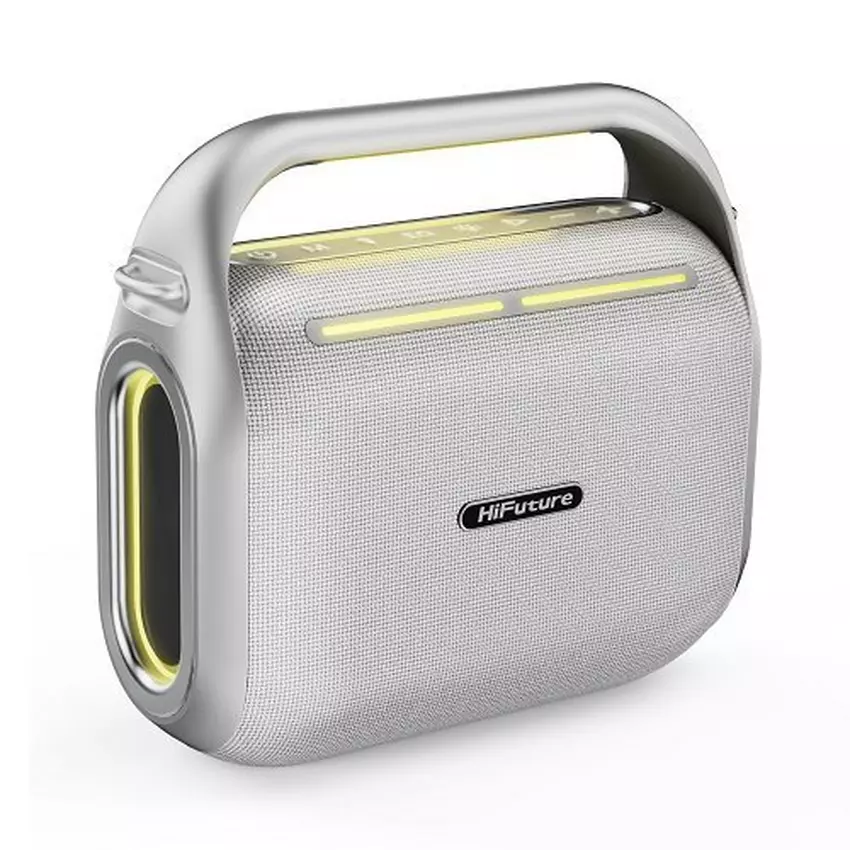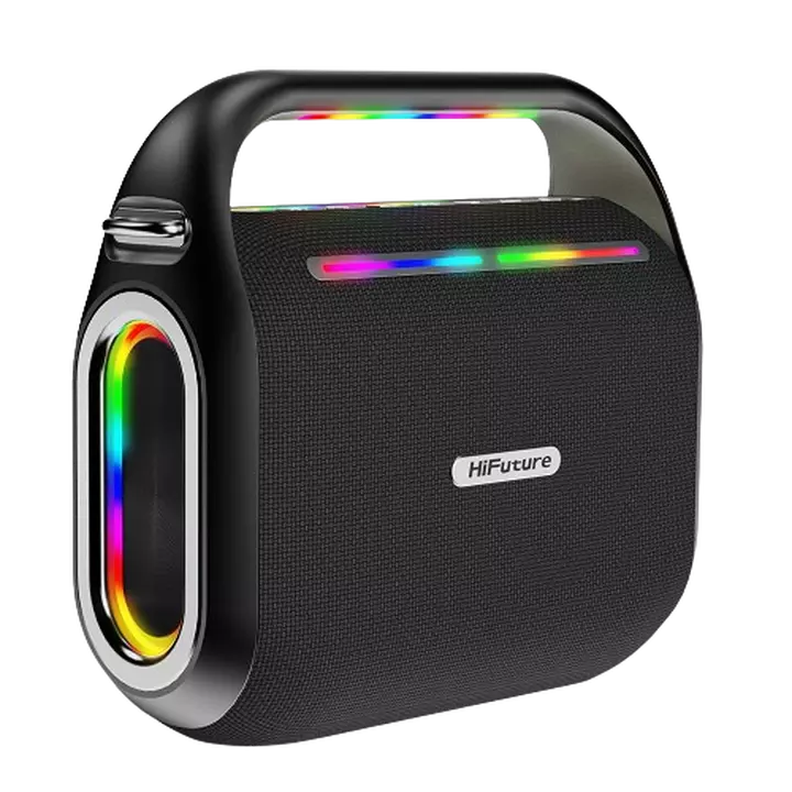 L’enceinte HiFuture MusicBox 200 est une enceinte Bluetooth portable de \(100W\) dotée de deux microphones sans fil, d’une batterie de \(12000mAh\) qui sert également de banque d’alimentation, de lumières RGB, et de la fonction TWS (True Wireless Stereo).