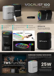 L’enceinte HiFuture Vocalist 100 est une enceinte portable de 25 W avec des micros sans fil, des éclairages RVB et la connectivité TWS (True Wireless Stereo) pour connecter deux enceintes.